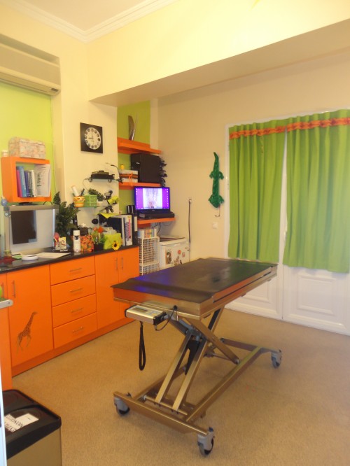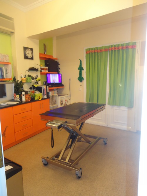 Η όλη διαδικασία διήρκησε 4 ημέρες αφού ολόκληρος ο εξοπλισμός του ιατρείου χρειάστηκε να μεταφερθεί έξω προκειμένου να αλλαχθεί το πάτωμα. Πολύ δύσκολη και κουραστική δουλειά, όμως το αποτέλεσμα μας αντάμειψε. Η αλλαγή του πατώματος ήταν μια ανάγκη η οποία έγινε αισθητή από τους πρώτους μήνες λειτουργίας του ιατρείου μου, εφόσον διαπιστώθηκε πως το ήδη υπάρχον πάτωμα από πλακάκι ήταν ολισθηρό και δυσκόλευε την βάδιση των ζώων. Το νέο πάτωμα από βινύλιο είναι αντιολισθιτικό και πολύ ασφαλές από άποψη υγιεινής,αφού η απολύμανσή του είναι πολύ πιο εύκολη.