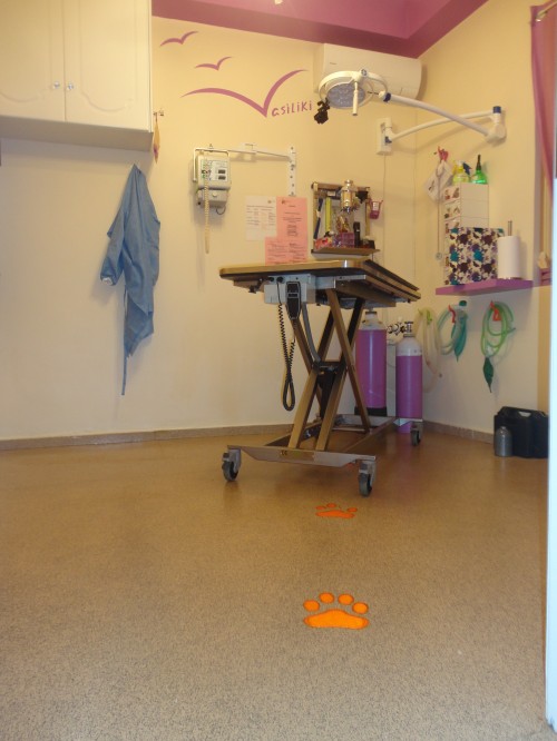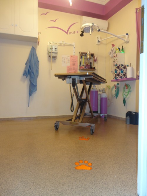 Όλοι οι χώροι του ιατρείου καλύφθηκαν με αντιολισθητικό δάπεδο βινυλίου(τύπου νοσοκομείου), προκειμένου η πρόσβαση των ζώων να είναι πιο άνετη και ασφαλής.