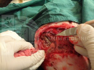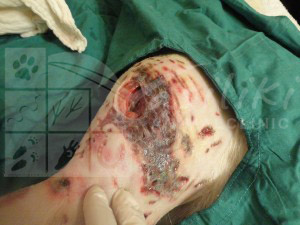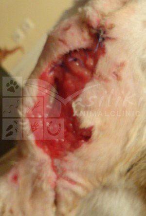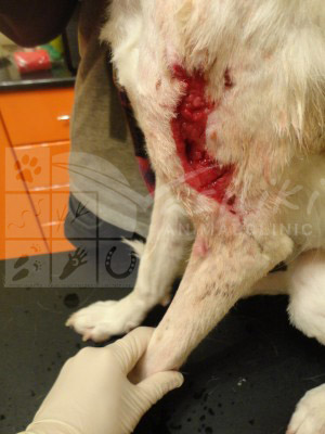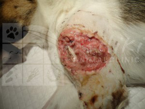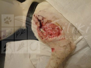 Αφού ο αρχικός φόβος να χάσουμε τη Φρέγια από εσωτερικές αιμορραγίες ξεπεράστηκε, άρχισε η διαχείρηση των τραυμάτων της! Ένας γολγοθάς πόνου και ταλαιπωρίας για το ζώο αφού όλο το δέρμα γύρω από το τραύμα του ποδιού της είχε νεκρωθεί και άφησε πίσω του μια βαθιά πληγή και το κόκκαλο εκτεθειμένο. Η αρχική εικόνα ήταν αποκαρδιωτική. Κανείς δεν πίστευε πως αυτό το τραύμα θα έκλεινε. Η συρραφή του ήταν αδύνατο να πετύχει αφού η καταστροφή των ιστών ήταν εκτεταμένη.