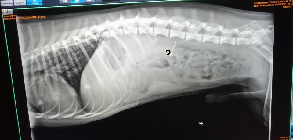 Για εμένα ήταν προφανές ότι αυτό που βασάνιζε τον μικρό ήταν μια απόφραξη στον πεπτικό σωλήνα του και συγκεκριμένα στο λεπτό έντερό του. Προφανές τόσο γιατί τα ευρήματά μου στις ακτινογραφίες και υπερήχους δήλωναν απόφραξη εντέρου αλλά και γιατί κράτησα τον Μπλάνκο στο ιατρείο για 24 ώρες και τον παρακολούθησα αφού τον τάϊσα! (Και τον ανέκρινα.....λέξη δεν του πήρα).