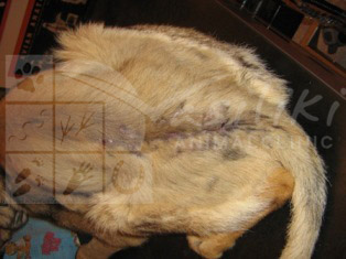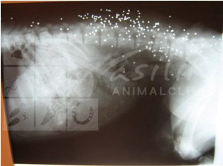 Για λόγους ηθικής και ευθύνης προς το κοινό που ενδεχομένως να επισκέπτεται την ιστοσελίδα μου, θα αποφύγω να δημοσιεύσω φωτογραφίες από το αρχικό τραύμα του ζώου και θα αρκεστώ μόνο στην περιγραφή του. Το τραύμα του Έκτωρα ήταν ανοιχτό και επικτεινόταν από την πίσω θωρακική μοίρα της σπονδυλικής του στήλης, κάλυπτε όλη την οσφυική μοίρα και την βάση της ουράς του. Το βάθος του ήταν τέτοιο ώστε η σπονδυλική του στήλη να είναι εκτεθειμένη και μέρος των αποφύσεων των δύο τελευταίων οσφυικών σπονδύλων είχε θρυμματιστεί. Τα σκάγια βρίσκονταν παντού . Πολλά έπεφταν κατά την διάρκεια του καθαρισμού του τραύματος και άλλα αφαιρέθηκαν μέσα από τους σπονδύλους του. Στις ακτινογραφίες φάνηκαν ξεκάθαρα τα σκάγια, όμως το αισιόδοξο ήταν πως ο θώρακας του ζώου ήταν άθικτος και σαν από θαύμα ο Έκτωρας δεν είχε υποστεί κατάγματα.