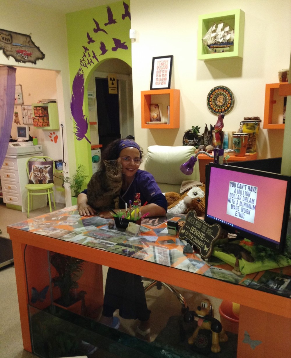 Todo el proceso duró cuatro días y eso porque todo el equipamiento de la clínica tenía que se llevado afuera, con el fin de cambiar el suelo. Este cambio era una necesidad que se hizo obvia desde los primeros meses del funcionamento de mí clínica, ya que se notó que las baldosas ya existentes eran resbaladizas y dificultaban el andar de los animales. Era una tarea muy difícil, pero el resultado valió la pena. El nuevo piso de vinilo es antideslizante y muy seguro en cuanto a la higiene, ya que la disinfección es mucho más fácil de hacer.