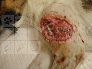 Αφού ο αρχικός φόβος να χάσουμε τη Φρέγια από εσωτερικές αιμορραγίες ξεπεράστηκε, άρχισε η διαχείρηση των τραυμάτων της! Ένας γολγοθάς πόνου και ταλαιπωρίας για το ζώο αφού όλο το δέρμα γύρω από το τραύμα του ποδιού της είχε νεκρωθεί και άφησε πίσω του μια βαθιά πληγή και το κόκκαλο εκτεθειμένο. Η αρχική εικόνα ήταν αποκαρδιωτική. Κανείς δεν πίστευε πως αυτό το τραύμα θα έκλεινε. Η συρραφή του ήταν αδύνατο να πετύχει αφού η καταστροφή των ιστών ήταν εκτεταμένη.